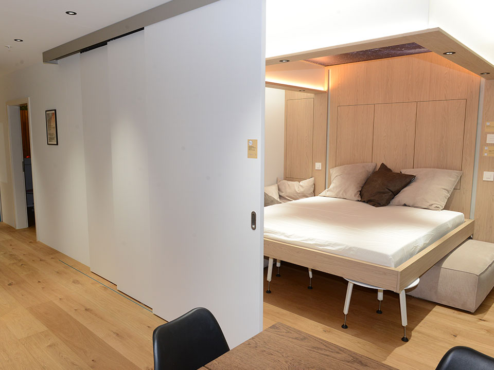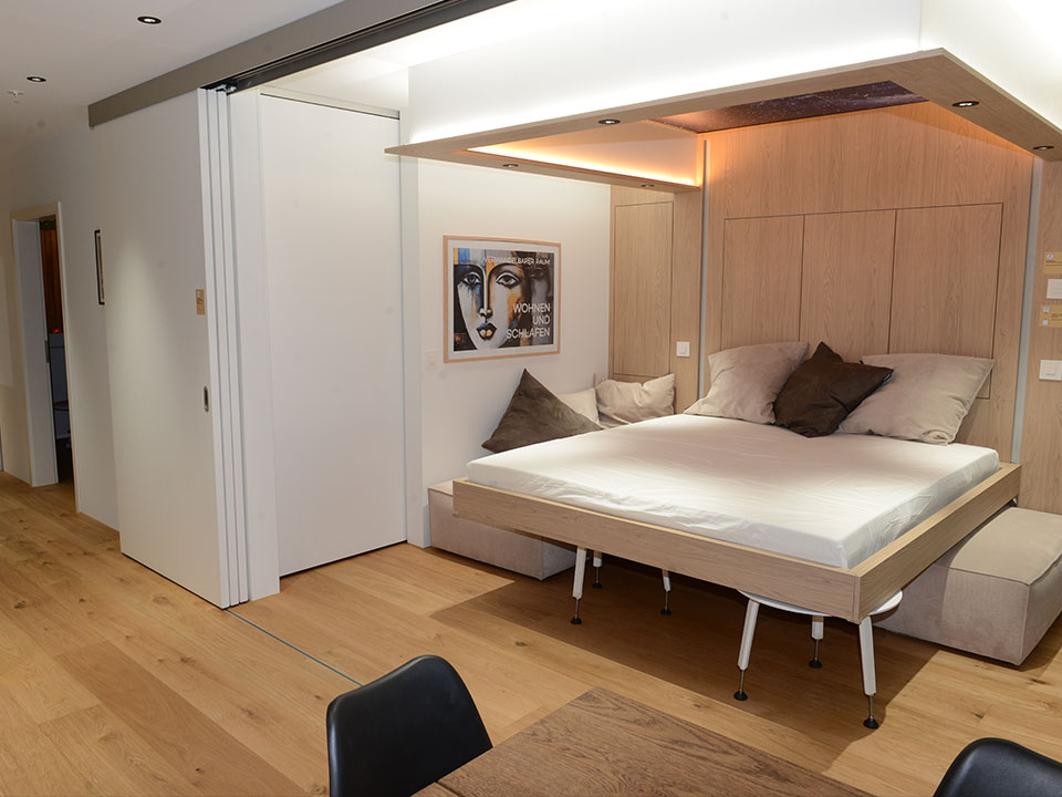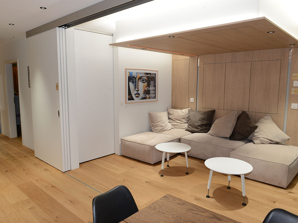 Die innovative Musterwohnung demonstriert, wie auf rund 50 m² Platz für eine Familie mit bis zu vier Personen geschaffen wird – ohne Komfortverlust. Durch clevere Raumplanung und multifunktionale Möblierung lässt sich das Wohnzimmer auf Knopfdruck in ein Schlafzimmer verwandeln, und das Kinderzimmer wird bei Bedarf zum Büro oder Spielzimmer.